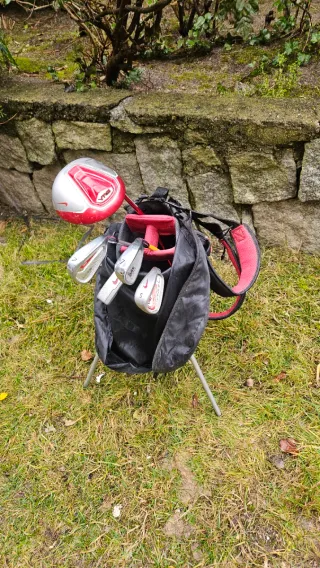 Set de palos de golf y bolsa, ideal para mujeres o jugadores junior. Incluye varios palos y una bolsa que esta sin usar, regalo hierrro 5 para completar. - Bolsa de golf negra con patas. - Varios palos de golf incluidos.
