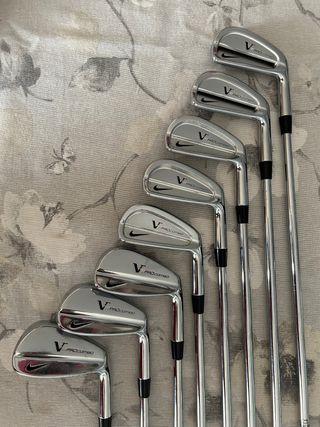 Hierros 9, 8, 7, 6, 5 y 4 NIKE VAPOR año 2015 en perfecto estado Varillas True Temper DYNAMIC GOLD R300 Pure Wrap Jumbo Verde origibales ______ Los Vapor Speed se han desarrollado teniendo en cuenta la búsqueda de la potencia. Los hierros tienen el peso abajo lo que promueve una trayectoria más alta y una mayor distancia. El centro de gravedad (CG) está equilibrado en el centro de la cara, y las cabezas de palo cuentan con caras «Spring Steel» con tecnología NexCor (una tecnología que aumenta la velocidad de la pelota para una amplia gama de jugadores). Los hierros largos (4, 5, 6, 7) tienen cavidades huecas reforzadas con Flybeam que ayudan con el retorno de energía y la estabilidad descentra, mientras que los hierros cortos (8, 9) tienen cavidades RZN que proporcionan retroalimentación refinada y estabilidad. Las ranuras en la cara del palo son más profundas y más cercanas entre sí (lo que Nike llama «X3X Groove Technology»), lo que promueve más giro de la bola. El ancho de la suela es moderado y el borde de ataque está biselado, y esto permite más perdón al golpear el césped.