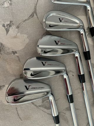 Set de hierros Nike VR II Pro Combo (año 2011) del 3 al PW. Diseñados para golfistas que buscan un equilibrio entre rendimiento y perdón. - Incluye 8 hierros (3, 4, 5, 6, 7, 8, 9, PW). - Varillas Dynamic Gold R300 (Regular Flex). Difícil conseguirlos en este estado hoy en día. Los hierros más largos tienen alguna marca de óxido muy superficial en la parte de la cavidad que no afecta el rendimiento y que se puede quitar. El hierro 7 tiene un pequeño golpe en la punta de la base del palo. Si tienes cualquier pregunta, no dudes en escribirme! Precio negociable.