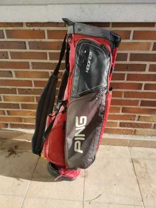 Bolsa de golf PING modelo Hoofer en color rojo y negro. - Patas automáticas para mayor estabilidad. - Compartimentos para palos. - Correa de hombro acolchada. Estado usado y gastado pero funcional: – Algunas costuras abiertas en la base (ver fotos) Ideal como bolsa de batalla o para empezar. Precio acorde al estado.