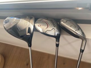 Set de tres palos de golf PING. - Driver PING 9.5° - Madera 3 PING 15.5° - Híbrido PING 17° Las 3 Varillas Stiff Por separado 90€/palo.