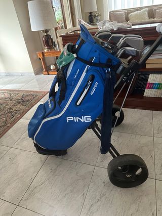 Bolsa de palos de golf de la marca PING en color azul. - Diseño moderno y funcional. - Múltiples compartimentos y bolsillos. - Correa ajustable para transporte.