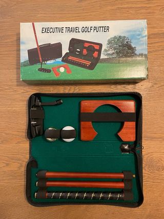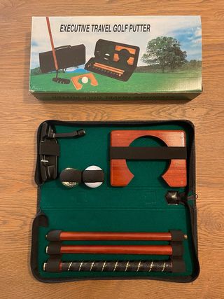 Set de golf domestico o de viaje Executive Travel Golf Putter. Incluye todo lo necesario para practicar en casa. - Palo de golf desmontable en varias secciones. - Base de madera con hueco para la bola. - Dos bolas de golf. - Bolsa de transporte con cremallera. - En muy buen estado de conservación, solo la base del putter tiene marcas de uso, ver ultima foto. - En mi perfil podéis ver mis opiniones y reviews para maxima garantía y seguridad.
