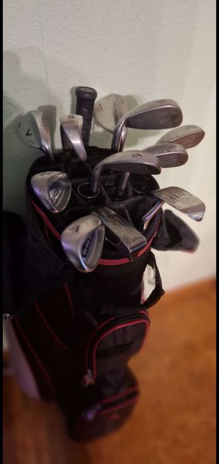 Se vende juego completo de 11 palos de golf, incluyendo la bolsa. - Incluye 11 palos de golf. 5 al pitch + approach (hechos a medida, las cabezas son clónicos de Calaway Big Bertha), chiper (marca Boomerang), 60o (marca Calaway), Sam (marca Srixon), Putt (marca Yes) - Bolsa de golf negra con detalles rojos.