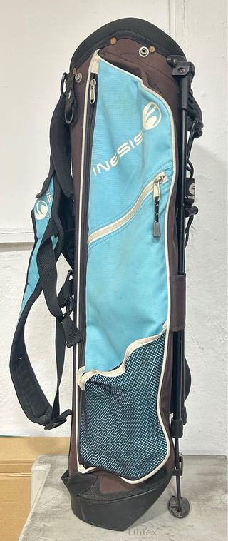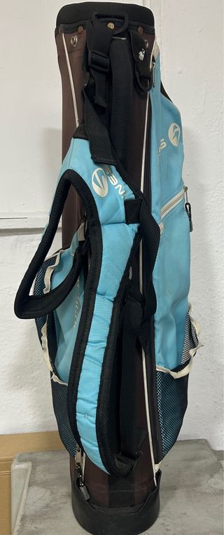 Bolsa de golf de tamaño infantil (75cm alto), con un diseño bicolor en azul y marrón. Es ligera y fácil de transportar. - Compartimentos para palos. - Correas de hombro acolchadas. - Bolsillos exteriores con cremallera. Incluye putter de 70 cm