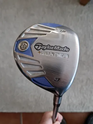 Madera 3 TaylorMade Burner con 15 grados de loft. Diseñada para ofrecer un buen rendimiento en el campo. - Cara metálica plateada. - Detalles en azul. - Número de palo '3' visible. - Grip buen estado. - Funda