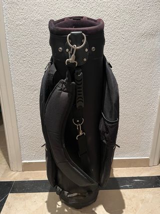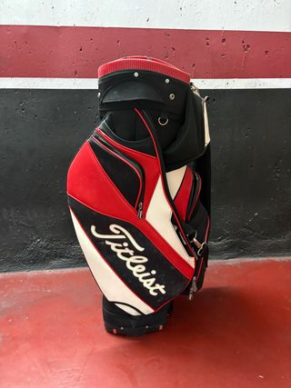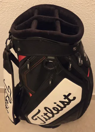 Bolsa de golf de la marca Titleist, con un diseño moderno en color negro y detalles en blanco. - compartimentos para palos. - Correa de hombro ajustable. - Bolsillos con cremallera. Usada pero en buen estado. Es grande con muxba capacidad de almacenamiento y múltiples bolsillos. En las fotos se muestran las marcas de uso así como las medidas.