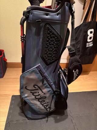 Bolsa de golf de la marca Titleist, con un diseño moderno y funcional. - Color azul marino y detalles en rojo. - Correa ajustable para el hombro. - Múltiples compartimentos para palos y accesorios.