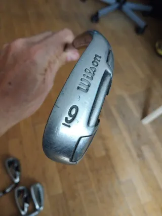 Set de palos de golf Wilson (y otras marcas) usados y con marcas del juego. Ideal para empezar de forma económica. Ideal para aprender y jugar tus priemros joyos, precio Negociable! - Incluye en total 11 palos de golf. -Driver Wilson -Hibrido4H Wilson -Hierros Wilson 9-8-6-5- PW -Hierro 7 Mizuno con varilla grafito -1x Putter Wilson -1x Putter antiguo Golden Bear -1x Putter antiguo Mizuno -1x Bolsa Wilson (cremallera rota)
