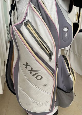 Bolsa de golf de la marca XXIO, con un diseño moderno y funcional. - Color gris plateado y detalles en rosa. - Múltiples bolsillos con cremallera. - Compartimentos para palos.