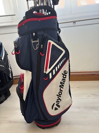 Bolsa palos golf taylormade para carrito. Tiene 7 bolsillos y 14 compartimentos para los palos de golf y 1 adicional para el putter. Utilizada muy poco tiempo. 2 bolsillos laterales grandes - 1 bolsillo pequeño con forro de terciopelo - 4 bolsillos para accesorios o bolas Accesorios - una correa de transporte - un velcro para el guante - una anilla para la toalla u otros accesorios - un compartimento para teléfono móvil en un bolsillo con cremallera - un portaparaguas Peso 4.5 kg Más
