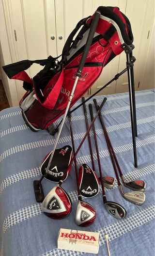 Set de golf Callaway XJ para niños. Incluye bolsa y varios palos. - Bolsa de golf Callaway XJ. - Palos de golf Callaway XJ: juegos de 7 palos callaway para niño/a de 10 años: driver, dos maderas, un hierro 6, un hierro 7, un sánd/wedge y un putt.