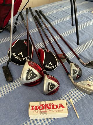 Se vende set completo de golf marcas Callaway y Cleveland y Blue Rage y crimson con bolsa y carro incluido, ideal aficionados que quieran un lote variado y listo para jugar. Contenido del set (9 palos en total): 1 madera de 7(21) Blue Rage 6 hierros (4,5,6,7,8,9, 1 hierro Cleveland de 56 - 14 1 recogebolas telescópico hasta 5 mts. Bolsa de golf con varios bolsillos y separadores. Carro manual plegable en muy buen estado marca Inesis