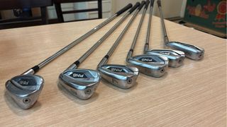 Set de palos de golf PING i525. - Diseño moderno y elegante. - Acabado metálico. - Marca PING. - 4,5,6,7,8,9,PW - Varilla 105 granos