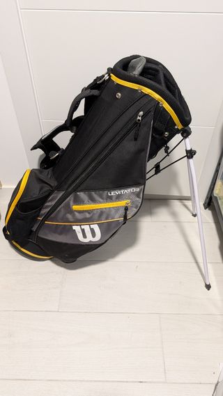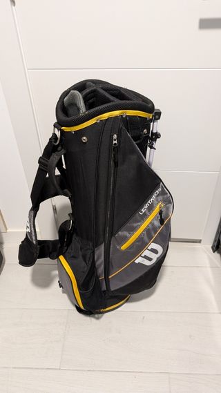Bolsa de golf Wilson en color negro con detalles en amarillo y gris. Diseñada para ser práctica y funcional. - Compartimentos para palos. - Bolsillos con cremallera. - Patas plegables para apoyo.
