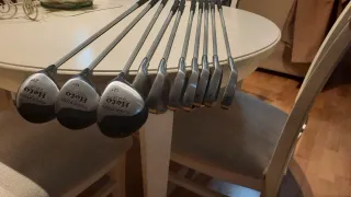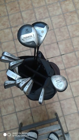 Juego de palos de golf usados en buen estado. Ideales para principiantes o jugadores ocasionales. - Incluye varios palos de diferentes tipos. - Algunos palos muestran señales normales de uso. - Perfectos para practicar en el campo de prácticas o jugar una ronda. uno de los palos esta valorado en 150€ y el carro solo cuesta 50 ,regalo las pelotas precio negociable