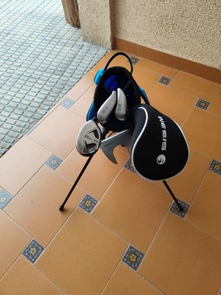Conjunto de palos de golf para niños en color azul de 11 a 13 años. Se ha utilizado en 4 ocasiones durante 2 meses. Está en perfectas condiciones en su caja original. - Bolsa de golf con soporte. - Palos de golf para iniciación. - Marca: Inesis - Incluye cajón de mini golf indoor y cepillo de limpieza de palos - Incluye 6 pelotas.