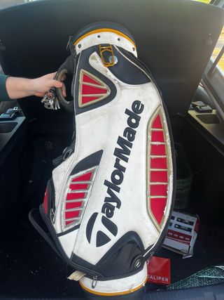No envío Bolsa de palos de golf TaylorMade con un diseño llamativo en blanco, negro y rojo. No se encuentra en las mejores condiciones pero hace su función sin problemas. - Marca: TaylorMade - Colores: Blanco, negro y detalles en rojo - Compartimentos para palos