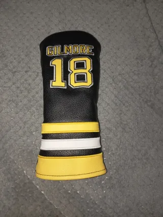 Funda para palo de golf con diseño inspirado en Happy Gilmore. - Color negro con detalles en amarillo y blanco. - Número 18 bordado. - Nombre GILMORE bordado.