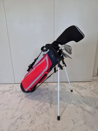 Set de palos de golf diseñado para niños de entre 8 y 12 años. Incluye bolsa con trípode. - Bolsa de golf con diseño en rojo, azul y gris. - Funda protectora para los palos.