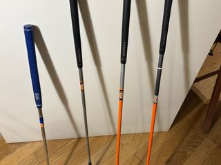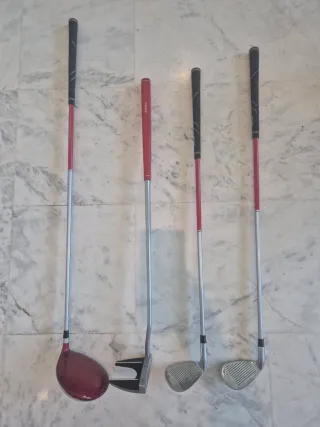 Set de palos de golf para niños, ideal para iniciarse en este deporte. Incluye varios palos de diferentes tipos. U.S. KIDS GOLF El pitch es medida 48 El putter es medida 48 El sand es medida 48 Driver es medida 45 Los otros dos palos son de Inesis Opcion a comprar la bolsa de golf (45 euros)