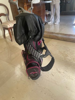 Set de palos de golf para niña, marca Valentina M. Incluye bolsa de transporte. - Diseño en color negro con detalles en rosa. - Bolsa con compartimentos y correa. - Funda protectora para los palos.