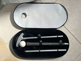 Completo juego de golf para practicar en cualquier lugar. Incluye todo lo necesario para empezar a jugar. 10€ cada uno dispongo de 2. Haz tu oferta. - Palo de golf desmontable en varias secciones. - Bola de golf. - Estuche de transporte negro con interior aterciopelado.