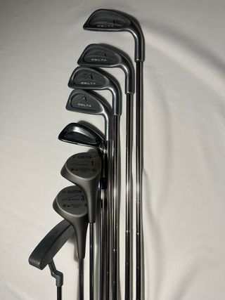 Conjunto de palos de golf de la marca Delta. - Incluye varios hierros con el logo Delta. - También se incluyen maderas Custom Metalwood 1 y 3. - Un putter Precision Cast también forma parte del set.
