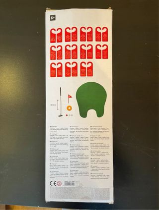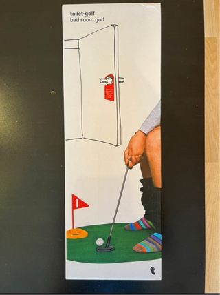 Divertido juego de mini golf para practicar en el baño. Incluye todo lo necesario para jugar. - Alfombrilla de césped artificial. - Palo de golf. - Pelota. - Bandera. - Señal de No molestar para la puerta.