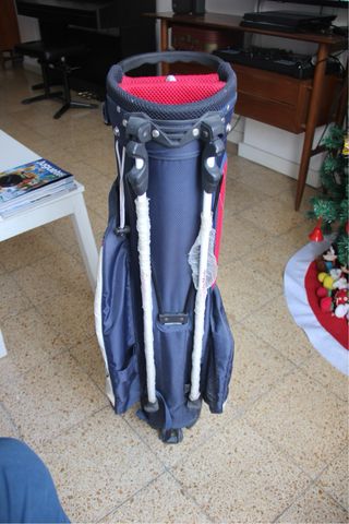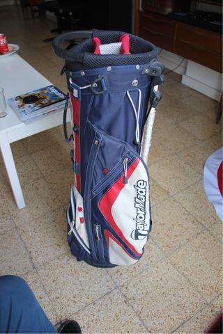 Bolsa de golf de la marca TaylorMade, con un diseño moderno y funcional. Dentro de los bolsillos laterales tiene suciedades de tierra que no consigo limpiar, de altura hace unos 85-87cm y es una bolsa fina y cómoda de llevar. Conserva el plástico en las patas. - Color azul, blanco y rojo. - Compartimentos para palos. - Asa superior para facilitar el transporte.