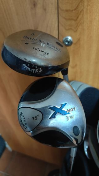 Vendo juego de palos de golf usados. Están en buen estado, con algunos signos normales de uso. Bolsa Ben Hogan Driver Cleveland 460 Madera Great Big Berta Madera Calaway Ben Hogan P, 3, 4, 5, 6, 8, 9, 52, 54, 60