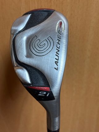 Palo de golf híbrido Cleveland Launcher. - Modelo: Launcher 2i - Diseño plateado con detalles en negro y rojo. - Logo de Cleveland Golf en la cara. - Nombre 'LAUNCHER' grabado en el palo.