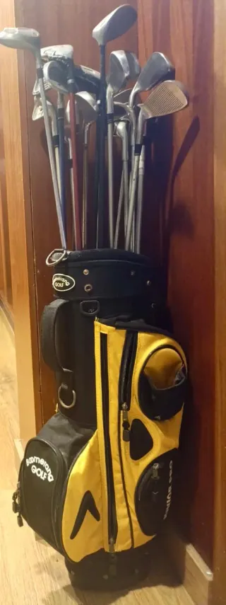 Se vende bolsa de golf Greenway en buen estado, con varios palos incluidos. - Incluye una bolsa de golf Greenway, de color amarillo y negro. - Contiene un juego de palos de golf usados, en aparente buen estado. - Ideal para principiantes o jugadores ocasionales.