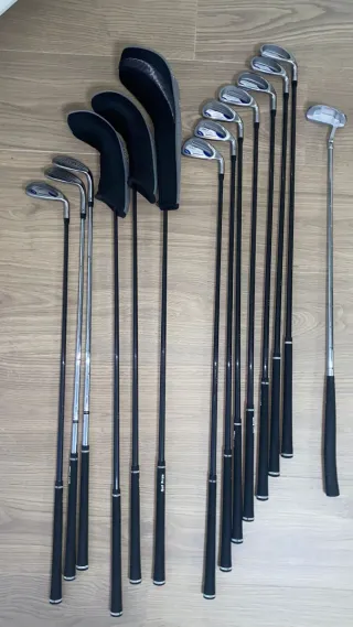 Set de palos de golf completo, ideal para jugadores de todos los niveles. Incluye varios palos y fundas protectoras. - Variedad de palos para diferentes golpes. - Fundas para proteger las cabezas de los palos.