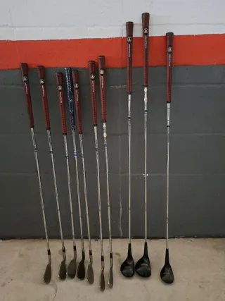 Conjunto de palos de golf. - Incluye varios palos de diferentes tipos. - Mangos con diseño. - Varillas metálicas.