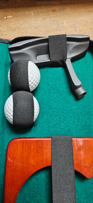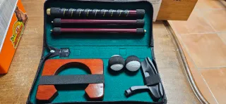 Estuche completo para practicar minigolf. Incluye todo lo necesario para empezar a jugar. - Palo de minigolf con mango texturizado. - Tres varillas de extensión de diferentes longitudes. - Base de madera para colocar las bolas. - Dos bolas de minigolf con fundas. - Palo de golf negro.