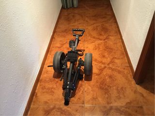 Carro de golf plegable de la marca Inesis. Ideal para transportar tus palos de golf en el campo. - Estructura principal de color negro. - Ruedas de goma. - Correa de sujeción para la bolsa.