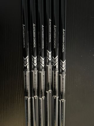 Set de varillas para palos de golf de la marca Mitsubishi Chemical. El diseño es negro con detalles plateados. Incluye 7 grips golf pride MCC plus - 45€ por unidad o €300 las 7 varillas - Marca: Mitsubishi Chemical y Kbs 85 S la del hierro 4 - Modelo: 85 S