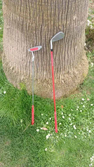 Set de palos de golf para niños, ideal para iniciarse en este deporte. Incluye tres palos de diferentes tamaños. - Tres palos de golf. - Mangos de goma para un mejor agarre.