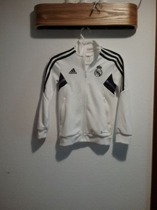 Conjunto de chándal oficial del Real Madrid. Talla niños de 7-8 años, 128 cm. - Chaqueta blanca con detalles morados y franjas negras. - Pantalón blanco a juego con franjas negras. - Logos de Adidas y del Real Madrid. - Cremallera frontal en la chaqueta. Ideal para regalo. No se vende por separado.