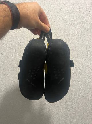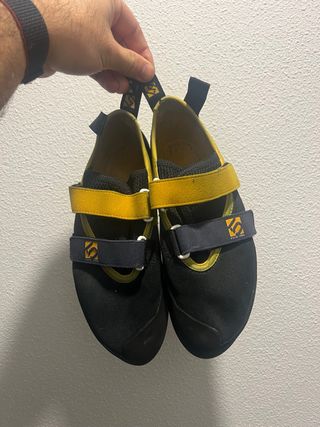 Pies de gato talla 41.5, de la marca Five Ten en color negro y amarillo. Muy poco usados. Ideales para empezar. - Cierre con velcro. - Tira de ajuste en el talón. - Suela de goma. Los vendo porque no los uso