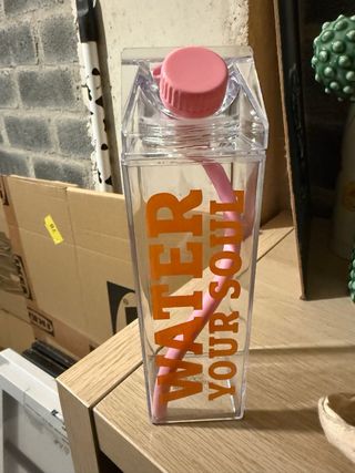 Botella de plástico transparente con pajita rosa. Tiene un diseño moderno y es fácil de transportar. - Material: Plástico - Altura: 15 cm - Incluye pajita