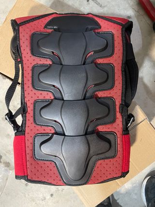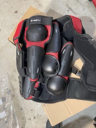 Protecciones a estrenar completo para espalda, torso, brazos y piernas, ideales para motociclismo o deportes de riesgo. Muy seguro y da tranquilidad para los adultos. - Color rojo y negro. - Material textil con refuerzos. - Cierres ajustables.
