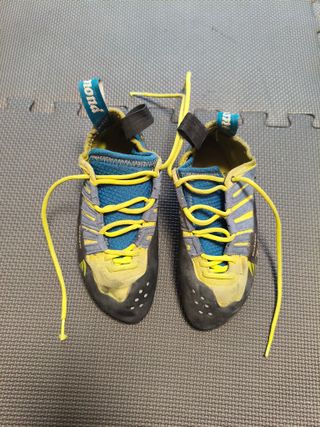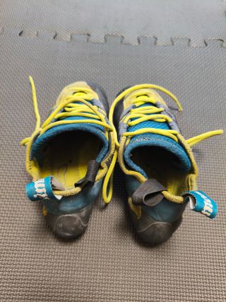 Pies de gato para escalada Simond Edge. Si los aguantas muy ajustados tallan bien, si no mejor para una talla 36 será perfecto. Mi hijo no los uso mucho porque con un 37 ya no los aguantaba. utilizados solo e rocodromo - Color azul y amarillo. - Cierre con cordones.