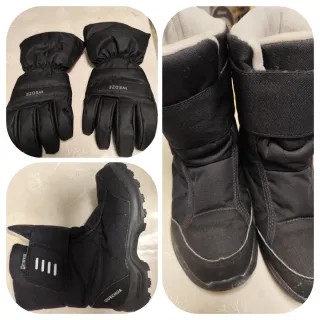 Conjunto de guantes y botas de nieve para niños. - Guantes negros marca Wedze. - Botas negras marca Quechua, con cierre de velcro. - Botas con etiqueta WATERPROOF.