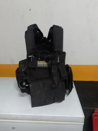Chaleco táctico ProTech Guns, ideal para airsoft o actividades similares. Diseñado para llevar equipo de forma organizada. - Color negro. - Múltiples bolsillos y compartimentos. - Cierre frontal. - Correa ajustable.