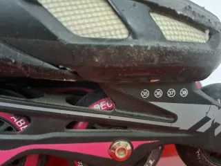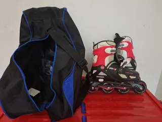 Set de patines en línea con bolsa de transporte. Multitalla 35 a 38 - Patines de color negro, rojo y blanco. - Bolsa de transporte negra con detalles azules.