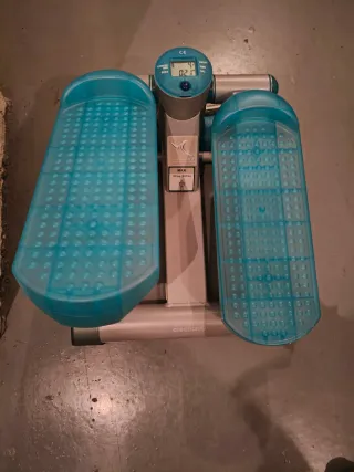 Stepper compacto para ejercicio en casa. Ideal para tonificar piernas y glúteos. - Pantalla digital que muestra pasos, tiempo y calorías. - Pedales antideslizantes con textura. - Estructura robusta de metal.