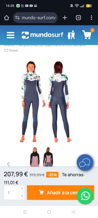 Neopreno Rip Curl Dawn Patrol 4/3mm para mujer, modelo CZ Flower. Traje de surf talla 14. Cuesta 320€ aunque ahora está rebajado a 200€ como pone en la foto. Lo vendo nuevo porque no lo puedo devolver ya y me queda grande. - Grosor de 4/3mm. - Diseño CZ Flower.