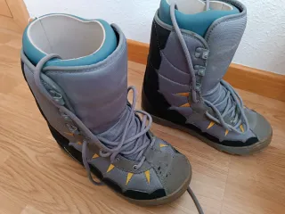 Botas de snowboard Burton Moto en talla 42. Diseñadas para ofrecer comodidad y rendimiento en la montaña. - Cierre con cordones. - Diseño en gris con detalles en amarillo y azul.